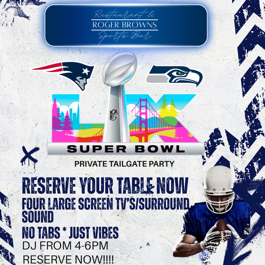 🏈🎧 Super Bowl Sunday at Roger Brown’s! No Tabs — Just Vibes. DJ spinning from 4–6PM to set the tone before kickoff! Tickets go fast — reserve yours now and lock in your spot!